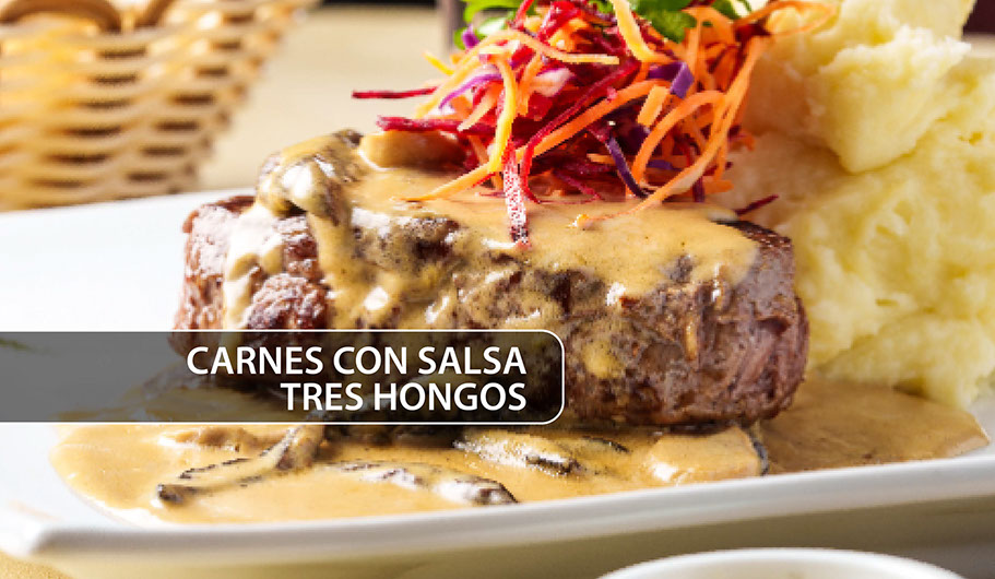 Lomo a la plancha bañado En Salsa De Champiñón, Zetas, Callampas Desglasados En Brandy, Reducción De Vino Tinto, Crema De Leche Con Puré.