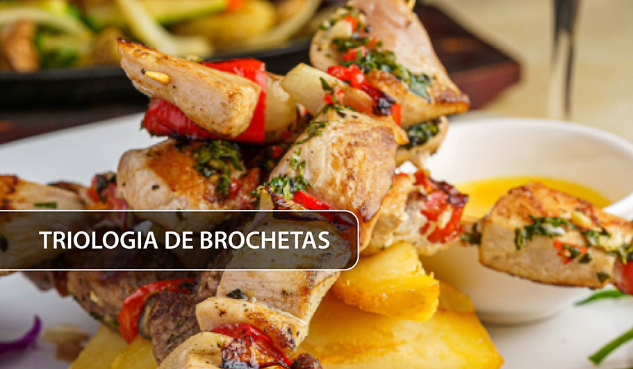 Brochetas de pollo, filete de vacuno, pescado con salsa de la casa y papas