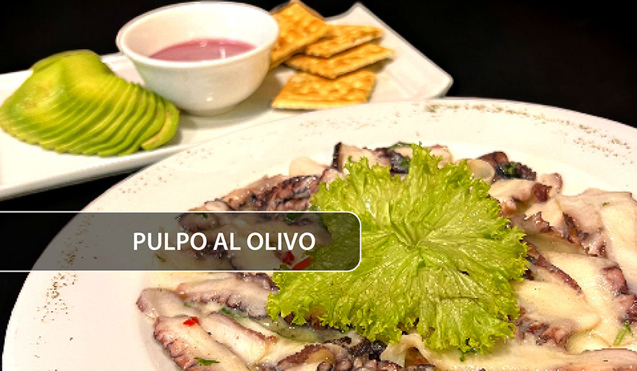 Finas Láminas De Pulpo En Salsa Acevichada Acompañado Con Choclo Peruano.