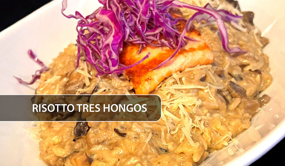Arroz cremoso, mantequilla, crema de leche, salsa tres hongos con filete de salmón a las finas hierbas.