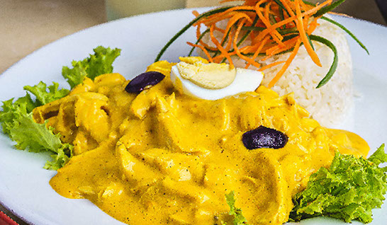 Pollo deshilachado en salsa de ají amarillo, con nueces acompañados con arroz blanco.