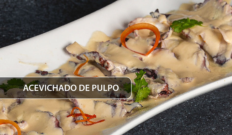 Finas Láminas De Pulpo En Salsa Acevichada Acompañado Con Choclo Peruano.